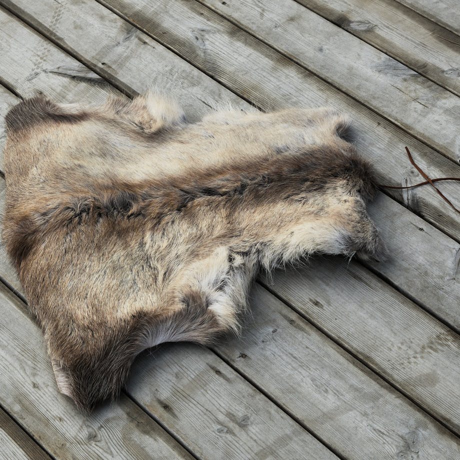 Reinskinn er lett å ta med på tur og utrolig varmt og godt å sitte på. Sittelappen er skaåret ut av et tørket reinskinn oghar naturlige kanter. En skinnsnor holder sittelappen sammenrullet når du bærer det med deg.
